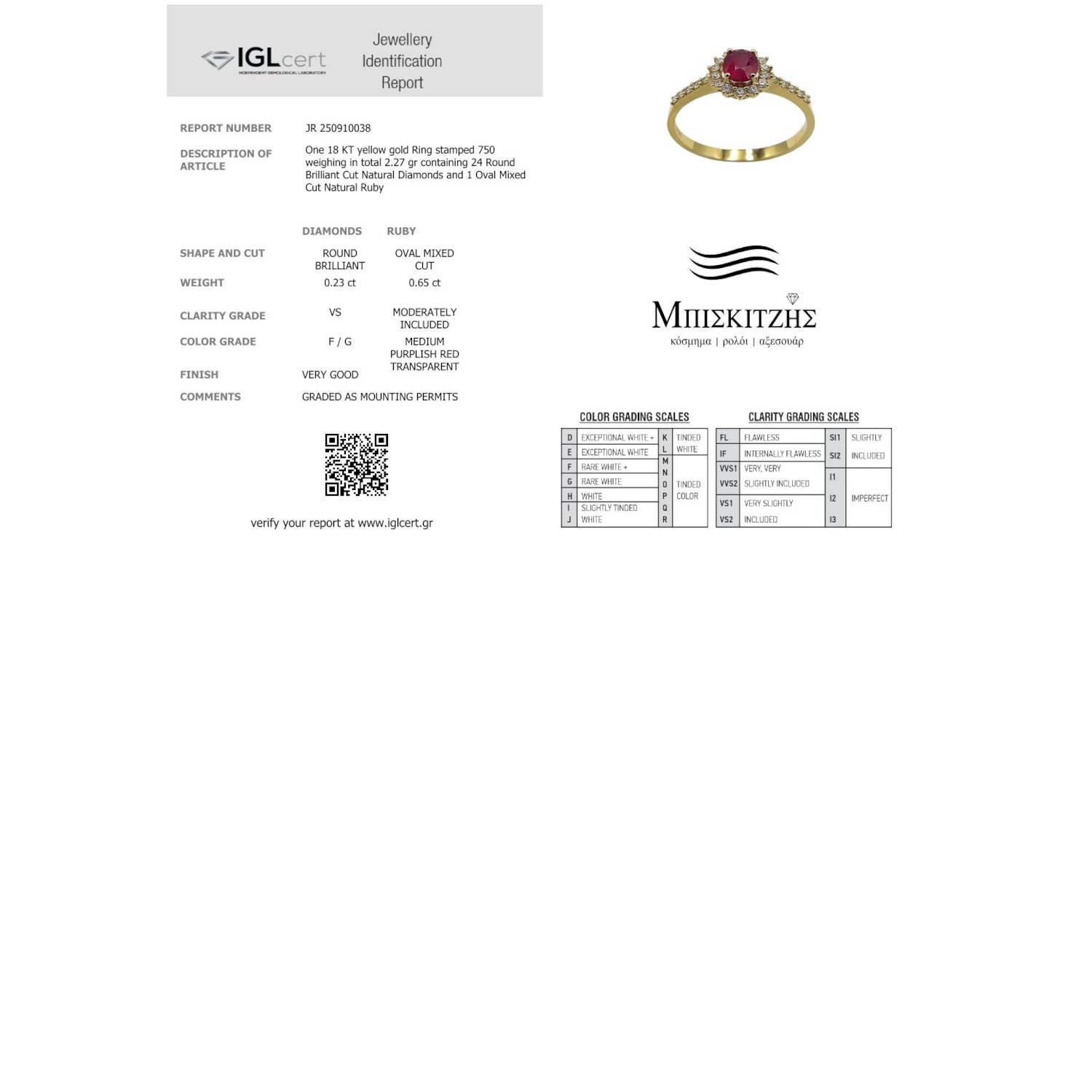 Ένα υπέροχο δαχτυλίδι ροζέτα, από Κίτρινο χρυσό 18 Καράτια με διαμάντια σε κοπή Brilliant και οβάλ Ρουμπίνι.
