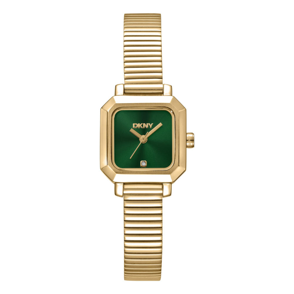 Ένα ρολόι της σειράς Everyday, του οίκου DKNY, από επιχρυσωμένο ανοξείδωτο ατσάλι με πράσινο καντράν.