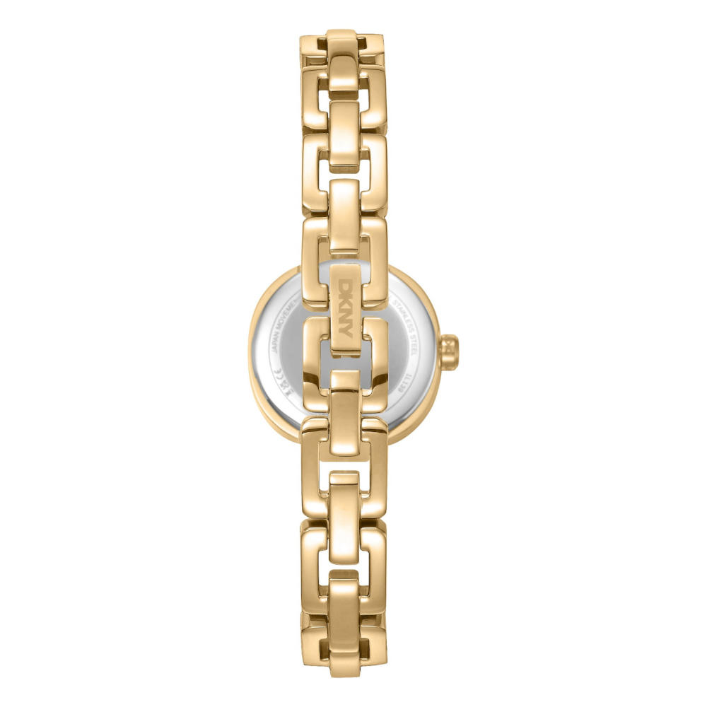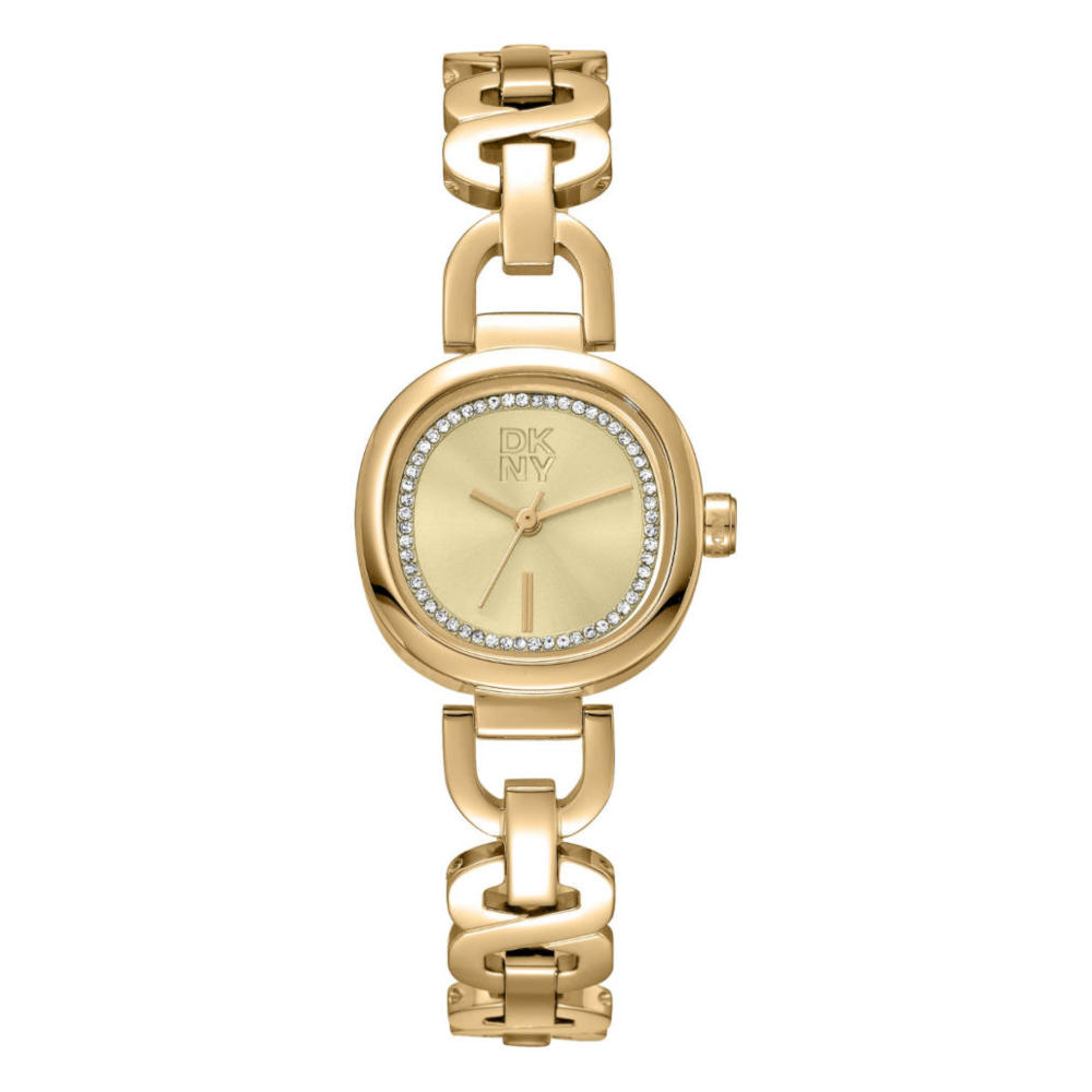 Ένα ρολόι της σειράς Everyday, του οίκου DKNY, από επιχρυσωμένο ανοξείδωτο ατσάλι με σαμπανιζέ καντράν και πέτρες ζιργκόν.
