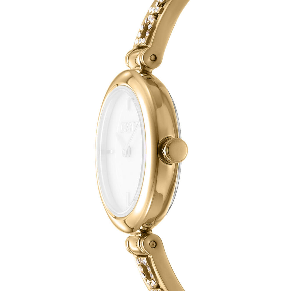 Ένα ρολόι της σειράς Logo, του οίκου DKNY, από επιχρυσωμένο ανοξείδωτο ατσάλι με λευκό φίλντισι στο καντράν και πέτρες ζιργκόν.