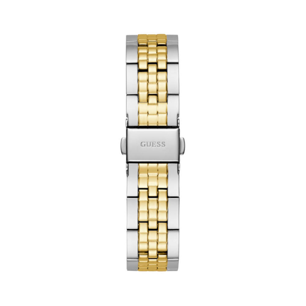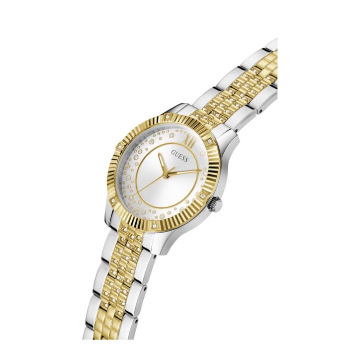 Ένα ρολόι της σειράς Starstruck, του οίκου Guess, από ανοξείδωτο ατσάλι και επιχρυσωμένο ανοξείδωτο ατσάλι με ασημί καντράν με ζιργκόν.