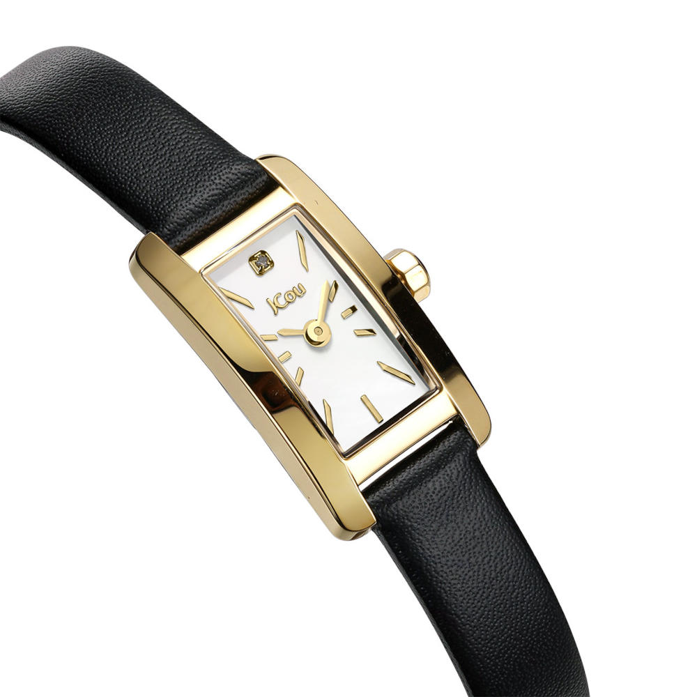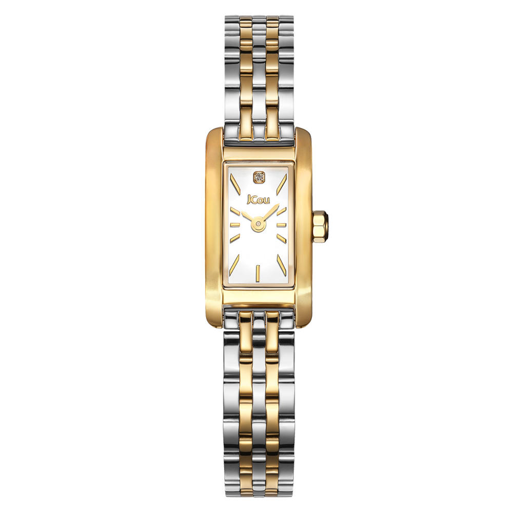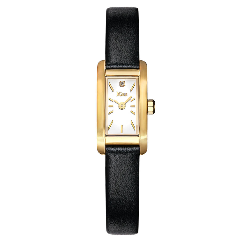 Ένα ρολόι της σειράς Ariadne, της εταιρείας JCou, από ανοξείδωτο ατσάλι και επιχρυσωμένο ανοξείδωτο ατσάλι με λευκό καντράν και ένα διαμάντι. Συνοδεύεται με ένα επιπλέον λουράκι από μαύρο δέρμα, σε συσκευασία δώρου.