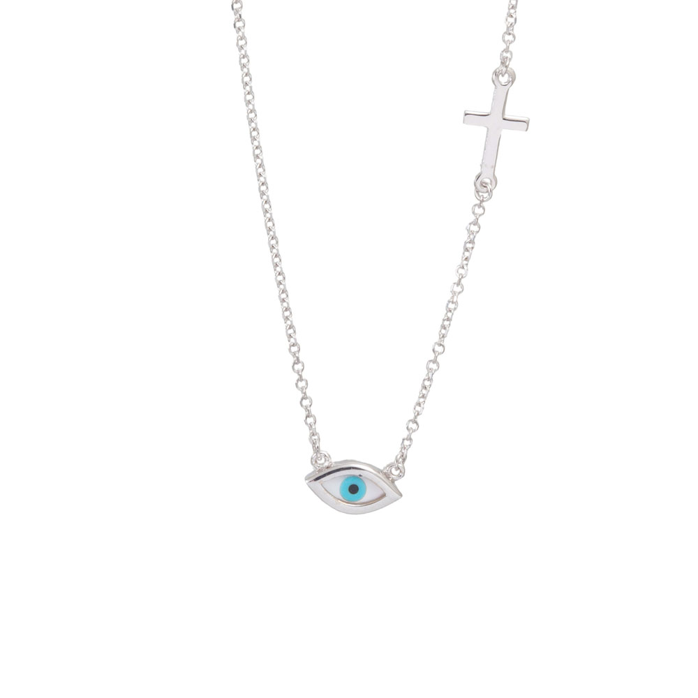 Ένα όμορφο κολιέ από Λευκόχρυσο 9 Καράτια, με σταυρουδάκι και ματάκι από φίλντισι.