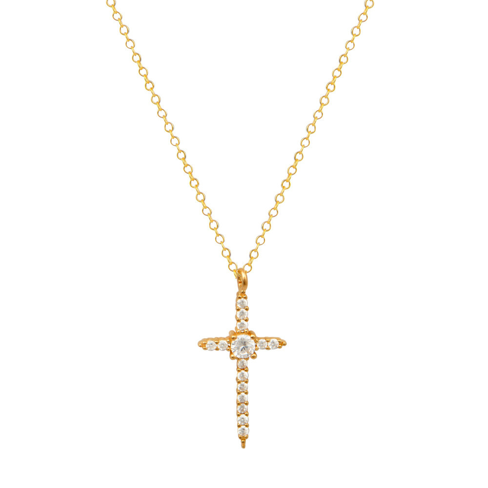 Ένα υπέροχο κολιέ με σταυρουδάκι, από κίτρινο επιχρυσωμένο ασήμι 925° με ζιργκόν.