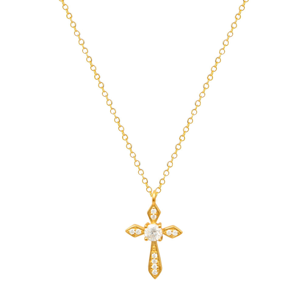 Ένα υπέροχο κολιέ με σταυρουδάκι, από κίτρινο επιχρυσωμένο ασήμι 925° με ζιργκόν.