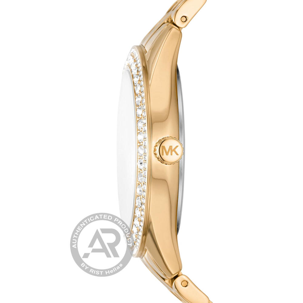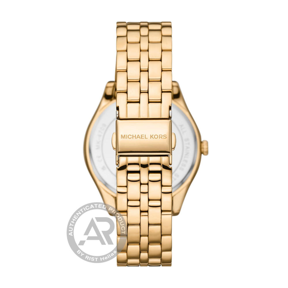 Ένα ρολόι, της σειράς Harlowe, του οίκου Michael Kors, από επιχρυσωμένο ανοξείδωτο ατσάλι με χρυσό καντράν και πέτρες ζιργκόν.