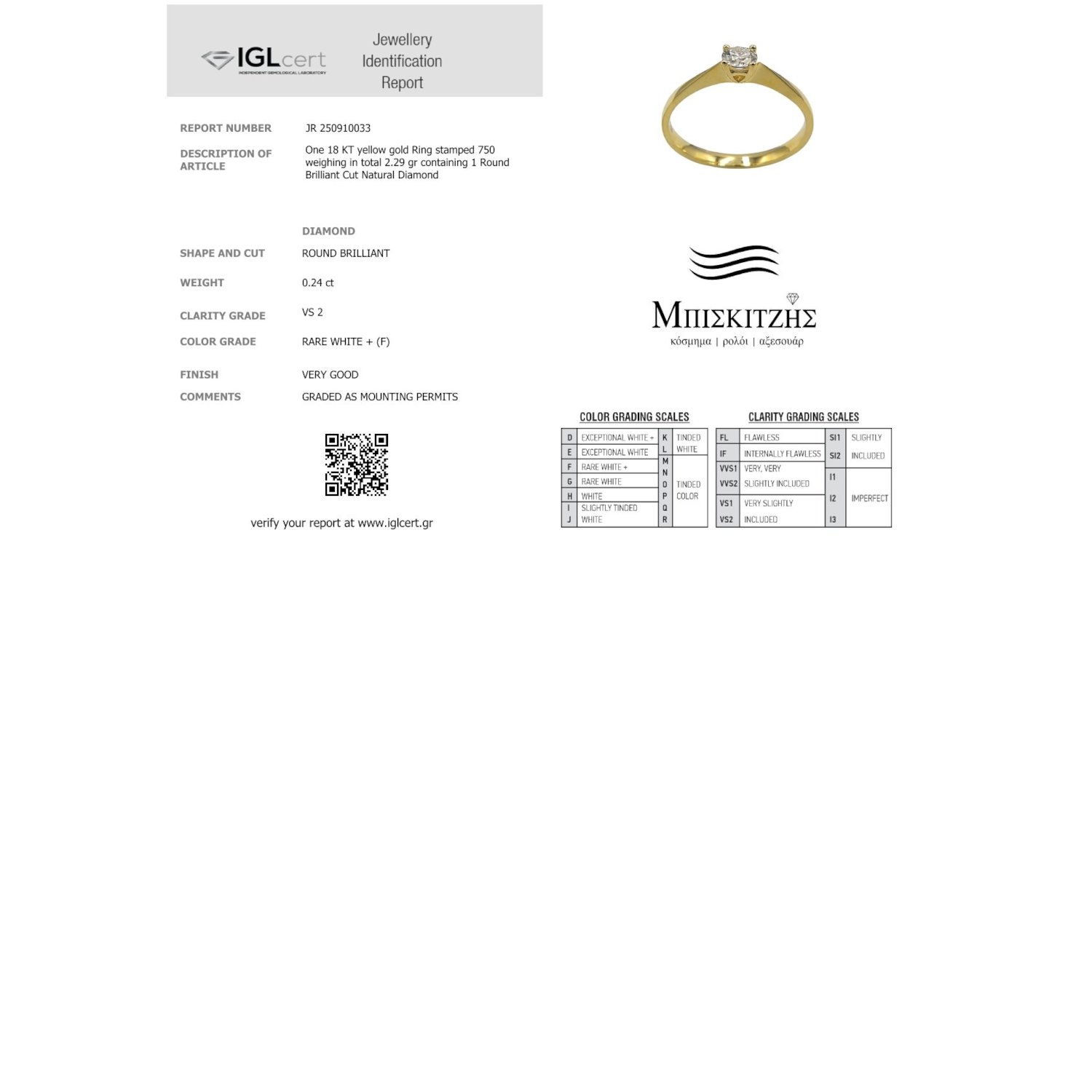 Κόψιμο: Brilliant, Καράτια: 0,24 ct, Καθαρότητα: VS2, Χρώμα: F, Πιστοποίηση: IGL (RN: JR250910033) |