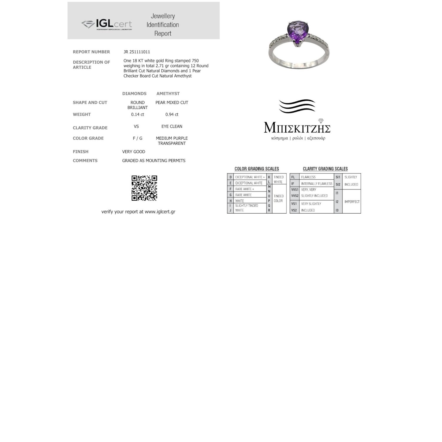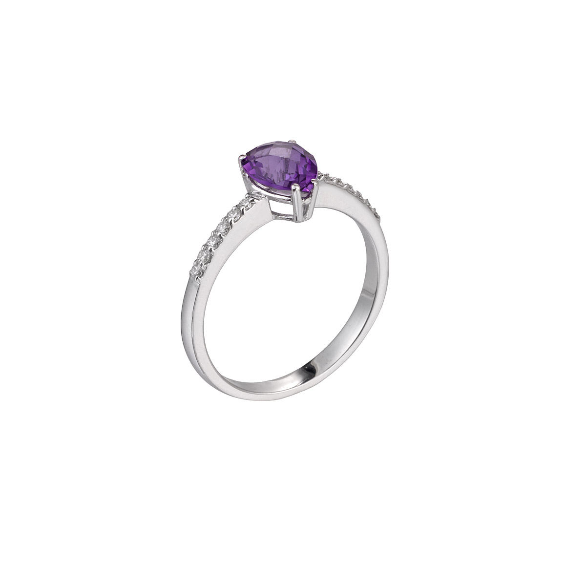 Μονόπετρο δαχτυλίδι από Λευκόχρυσο 18 Καράτια με διαμάντια σε κοπή Brilliant και Αμέθυστο σε σχήμα δάκρυ.