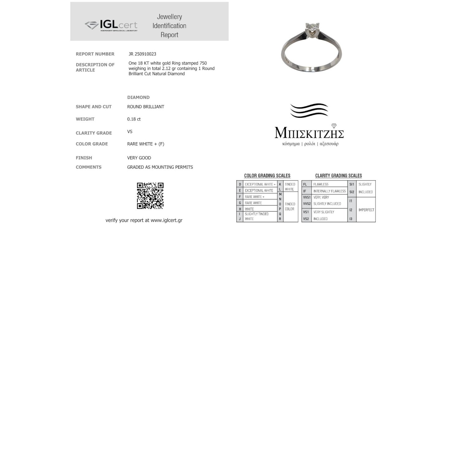 Κόψιμο: Brilliant, Καράτια: 0,18 ct, Καθαρότητα: VS, Χρώμα: F, Πιστοποίηση: IGL (RN: JR250910023) |
