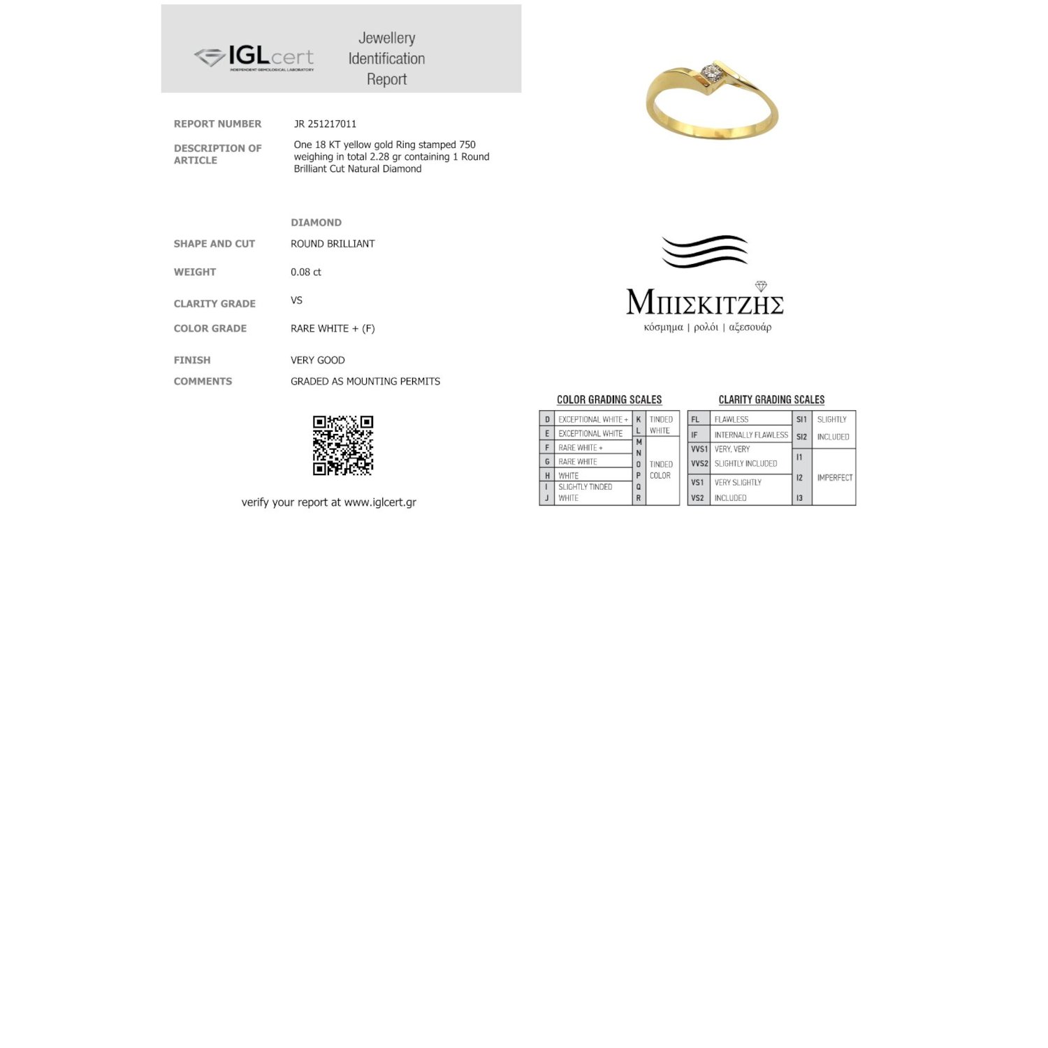 Κόψιμο: Brilliant, Καράτια: 0,08 ct, Καθαρότητα: VS, Χρώμα: F, Πιστοποίηση: IGL (RN: JR251217011) |
