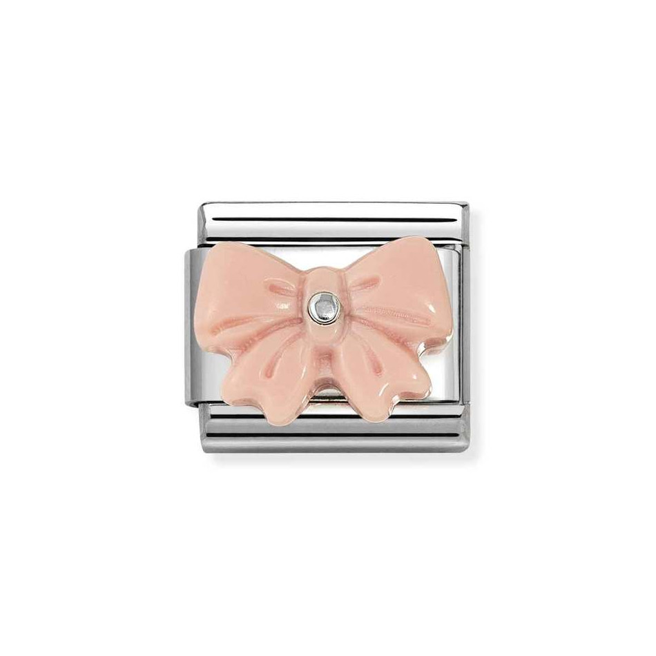 Composable link για τη βάση Nomination, από ανοξείδωτο ατσάλι, με επιπλατινωμένο ασήμι 925° και φιόγκο από ροζ συνθετική πέτρα.