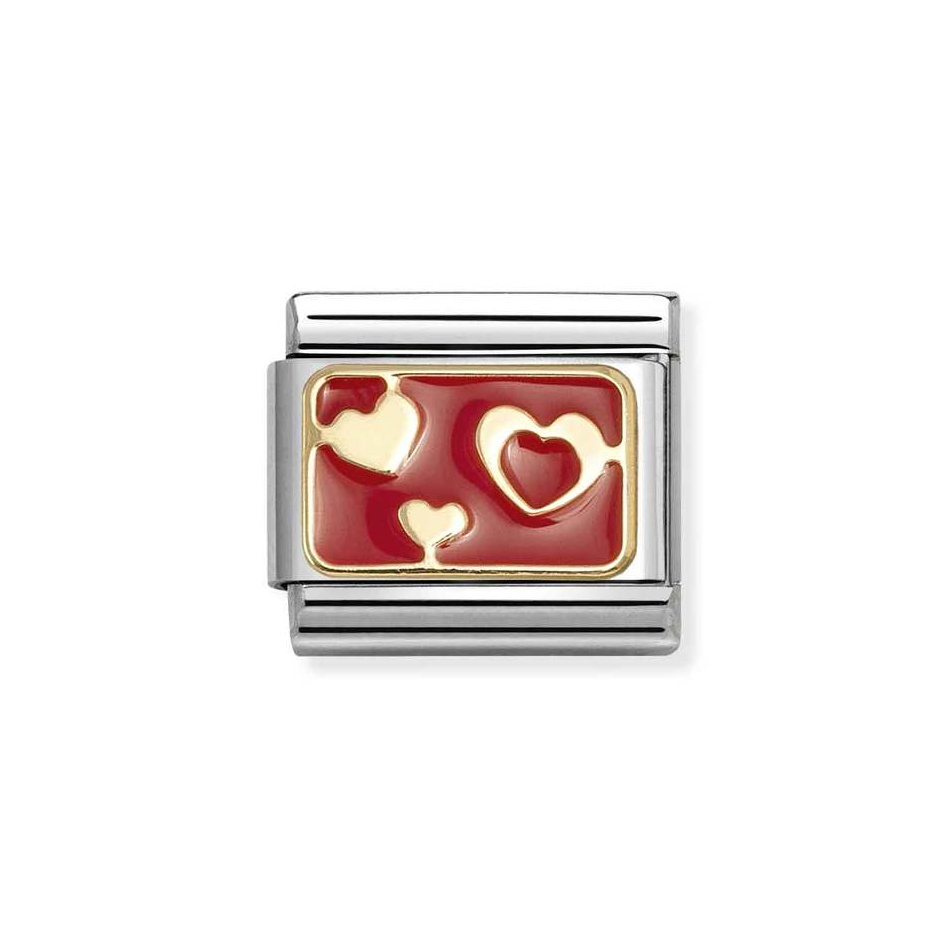 Composable link για τη βάση Nomination, από ανοξείδωτο ατσάλι, με σχέδιο καρδιές από Κίτρινο χρυσό 18 Καράτια με σμάλτο.