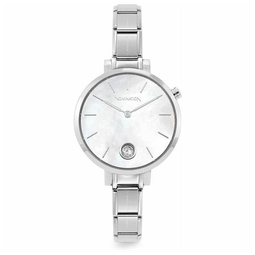 Ένα ρολόι της εταιρείας Nomination, από ανοξείδωτο ατσάλι, με φίλντισι στο καντράν και ζιργκόν.