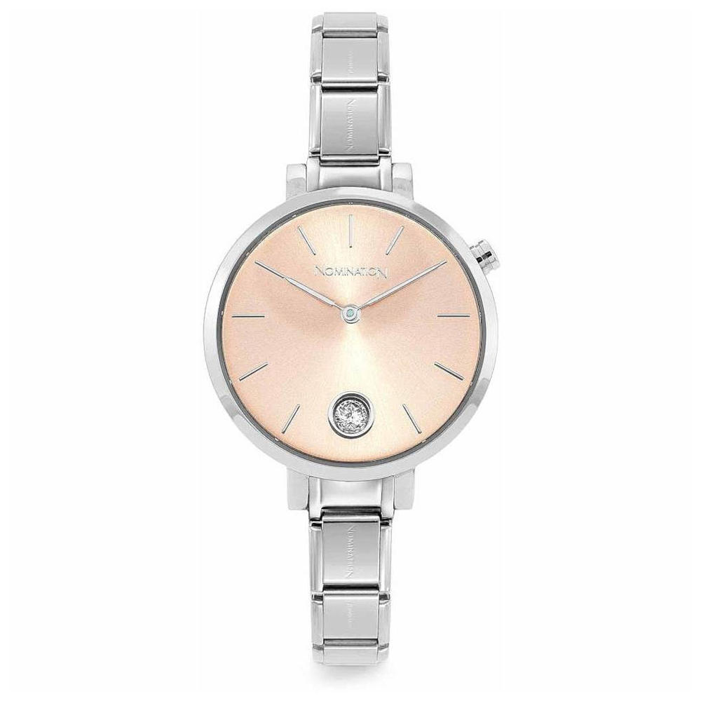 Ένα ρολόι της εταιρείας Nomination, από ανοξείδωτο ατσάλι, με ροζ καντράν και ζιργκόν.