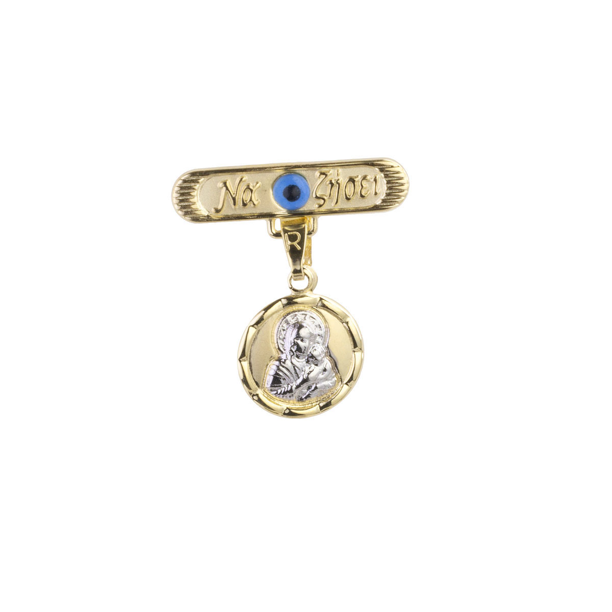 Μια όμορφη παραμάνα με κρεμαστό φυλαχτό, από Κίτρινο χρυσό και Λευκόχρυσο 9 Καράτια, με ματάκι. Ιδανικό δώρο για νεογέννητο.
