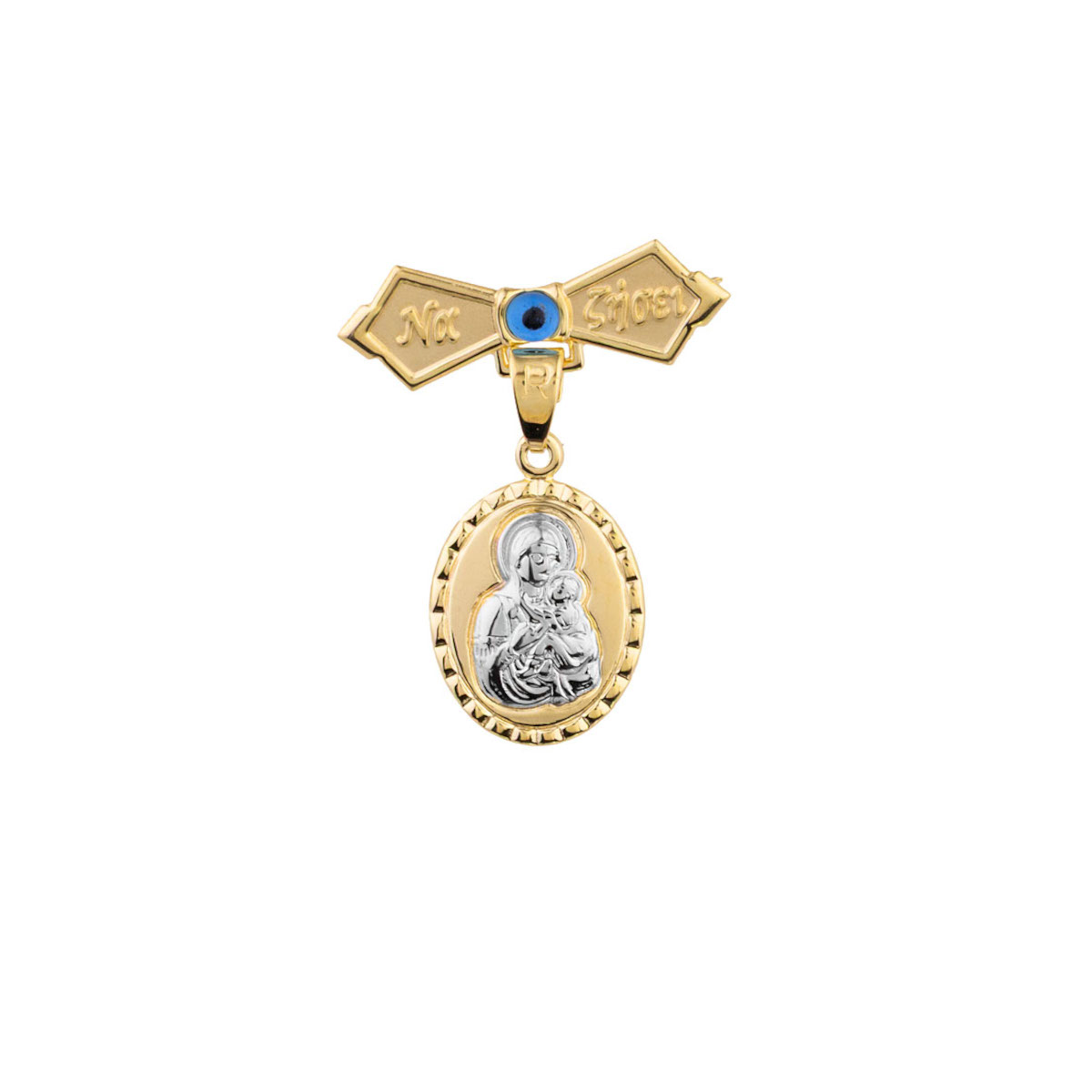 Μια όμορφη παραμάνα με κρεμαστό φυλαχτό, από Κίτρινο χρυσό και Λευκόχρυσο 9 Καράτια, με ματάκι. Ιδανικό δώρο για νεογέννητο.