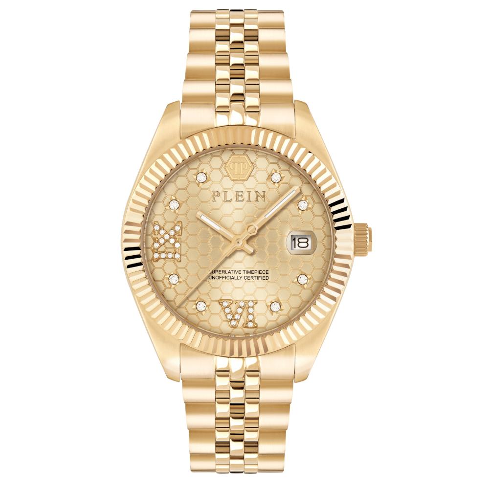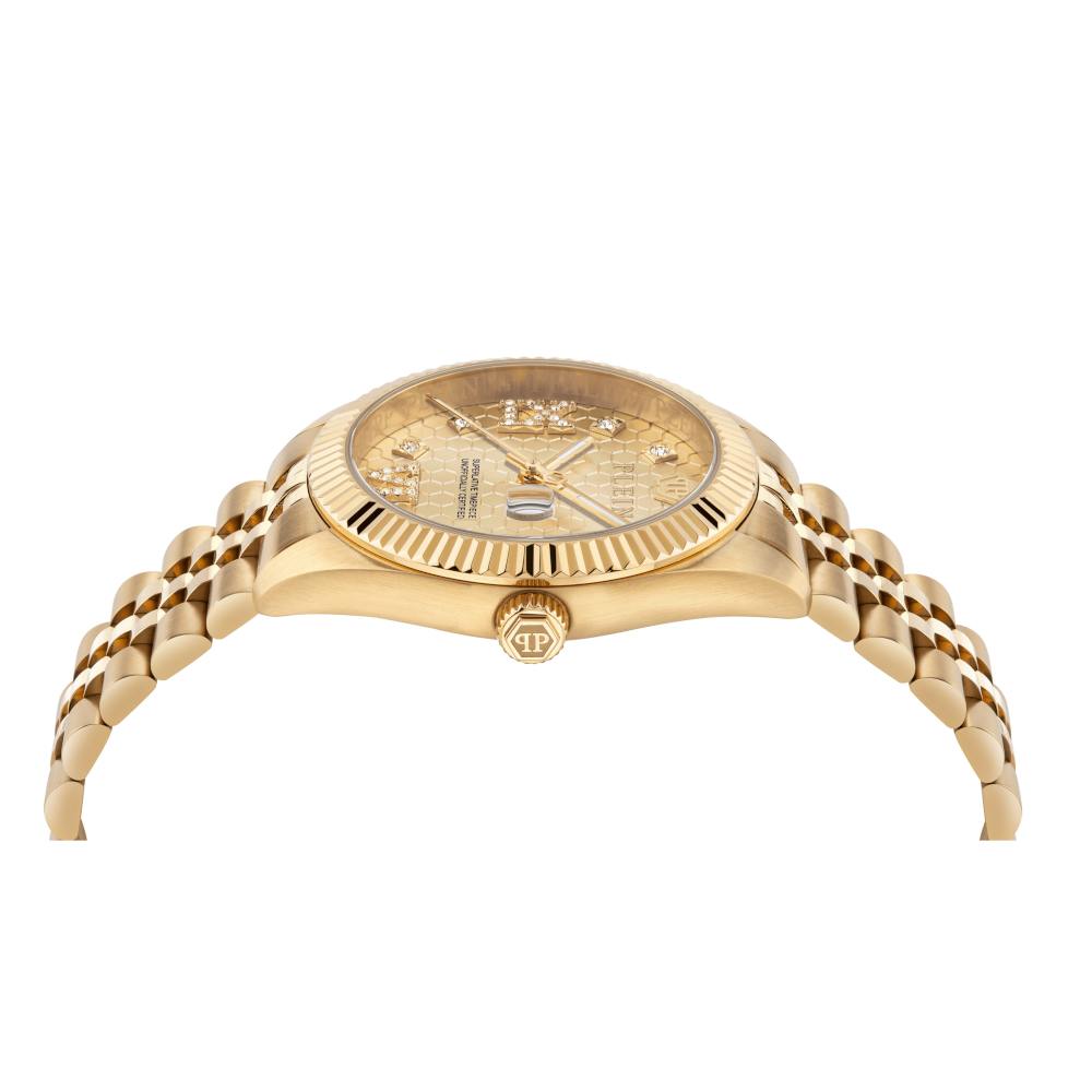 Ένα ρολόι, της σειράς Date Superlative, του οίκου Philipp Plein , από επιχρυσωμένο ανοξείδωτο ατσάλι με χρυσό καντράν και πέτρες ζιργκόν.