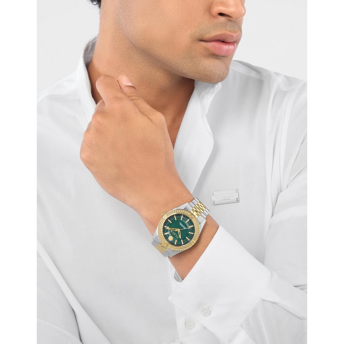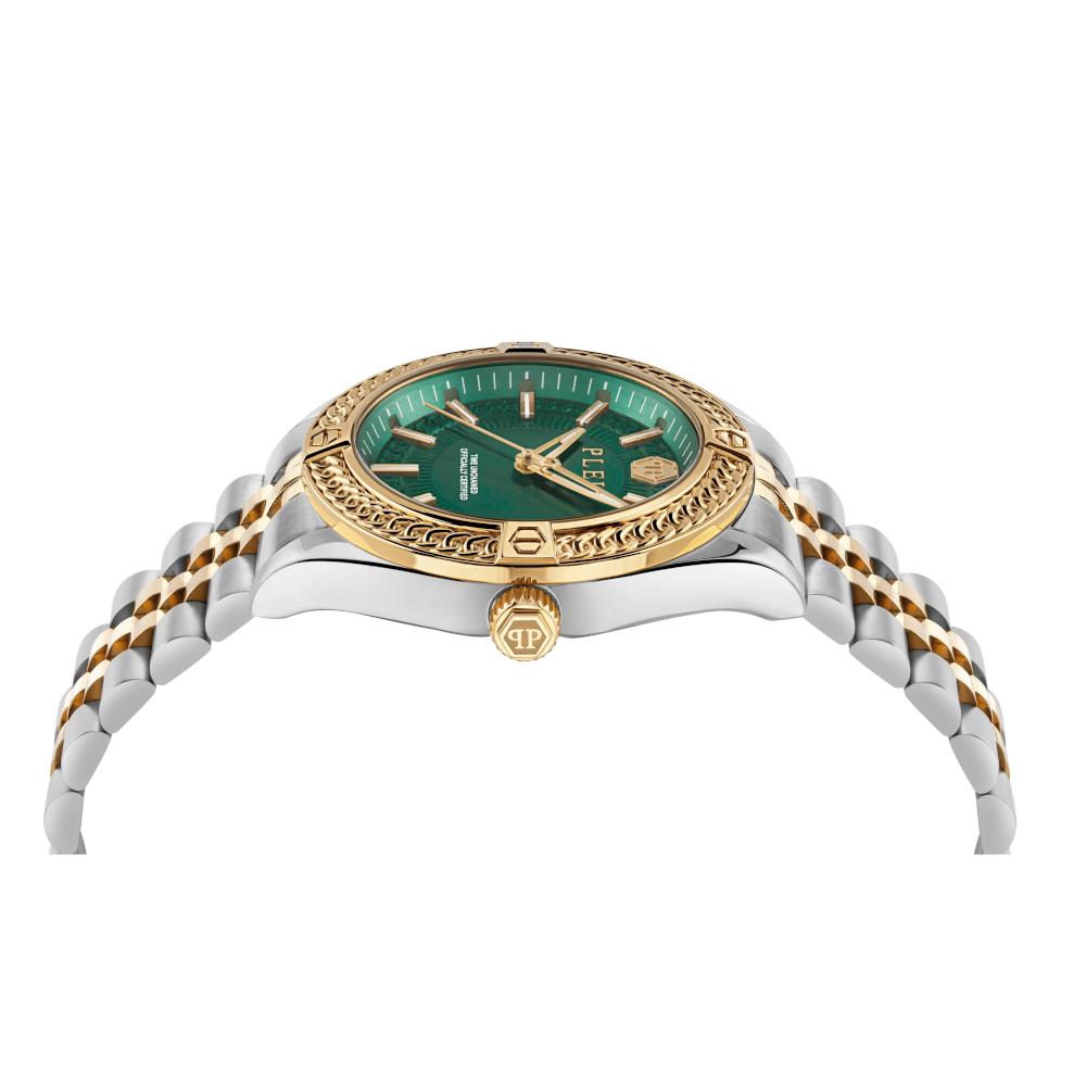 Ένα ρολόι, της σειράς Icon Chain, του οίκου Philipp Plein, από ανοξείδωτο ατσάλι και επιχρυσωμένο ανοξείδωτο ατσάλι, με πράσινο καντράν.