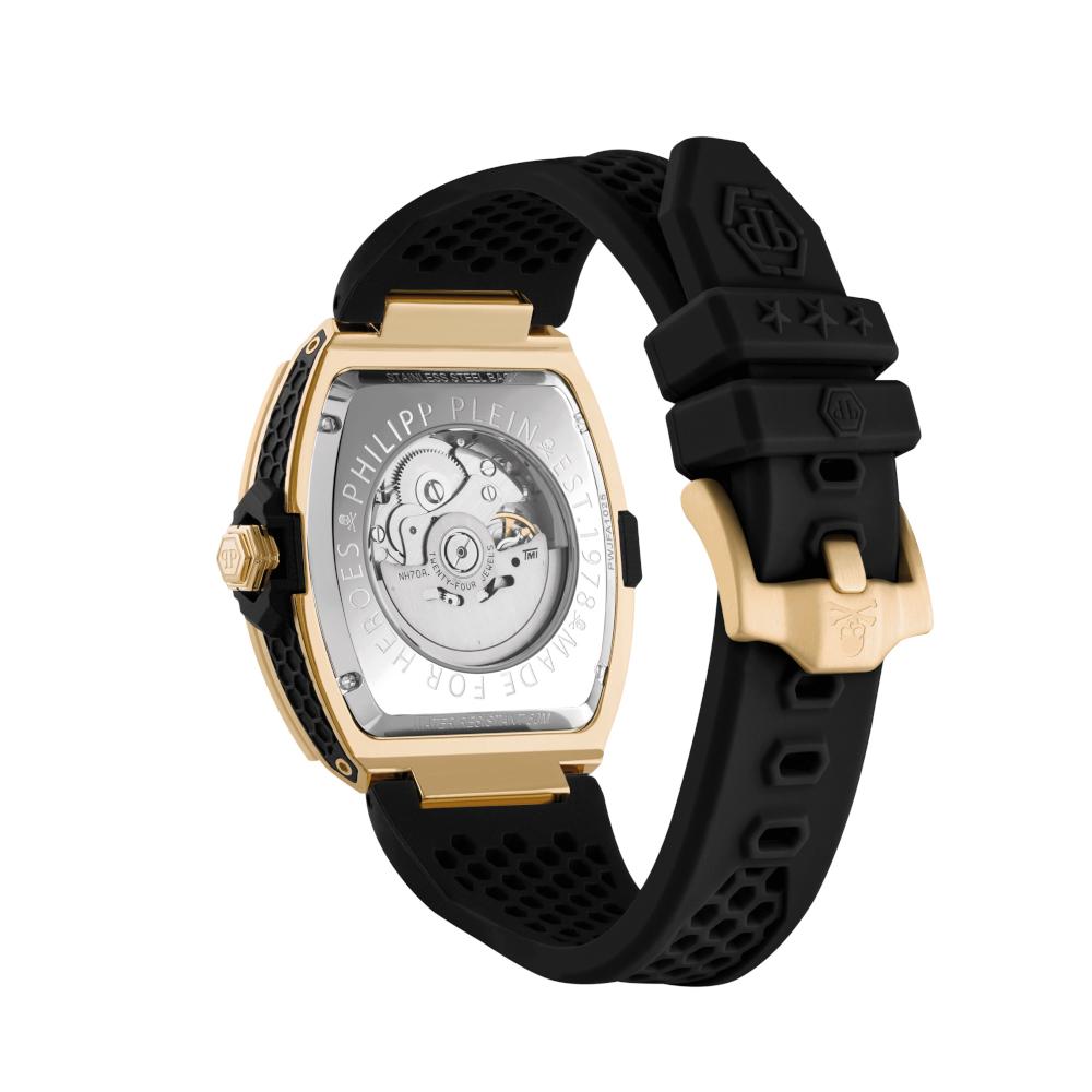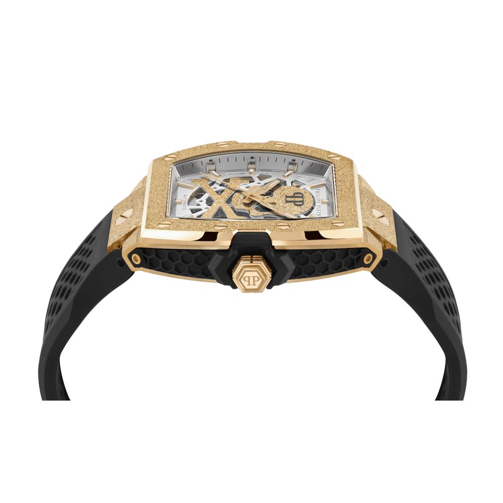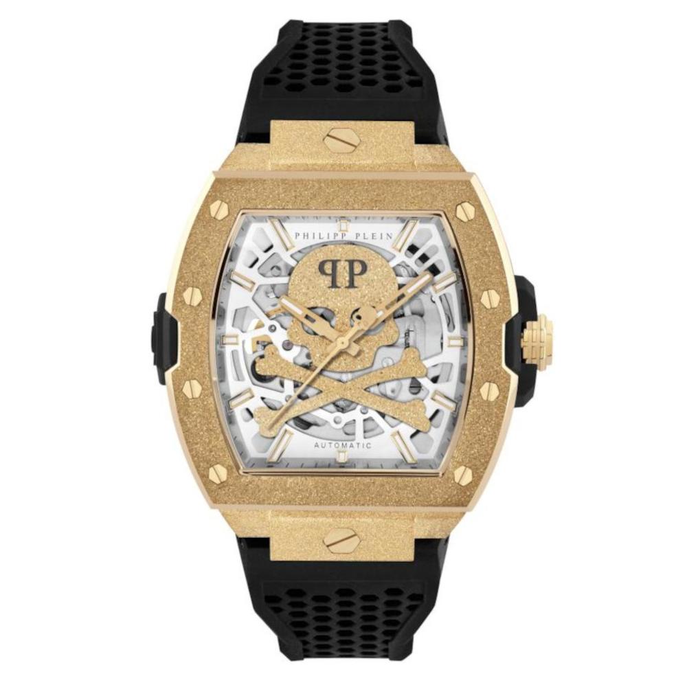 Ένα αυτόματο ρολόι της σειράς Skeleton Frosted, του οίκου Philipp Plein, από επιχρυσωμένο ανοξείδωτο ατσάλι, με skeleton καντράν και μαύρο καουτσούκ λουράκι.