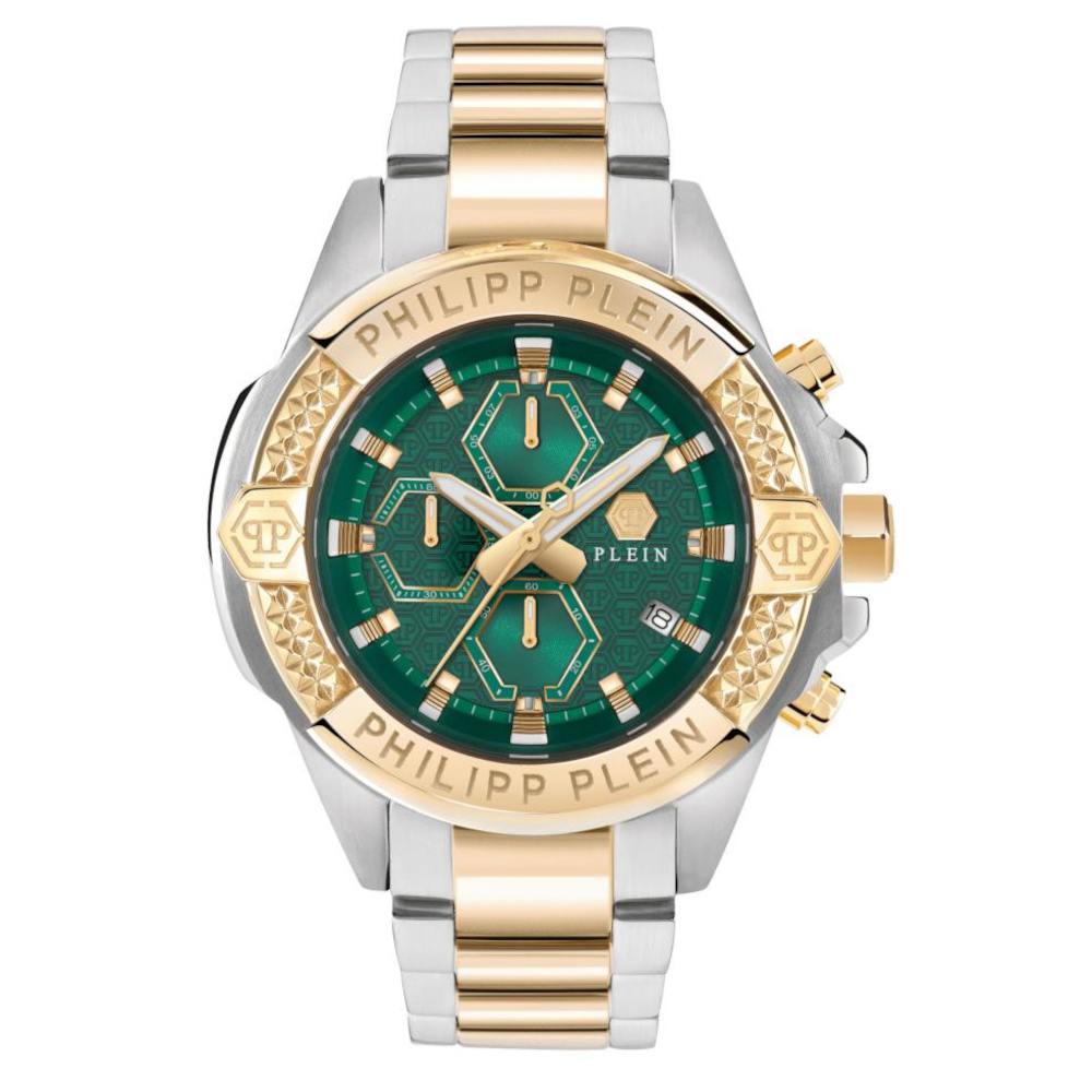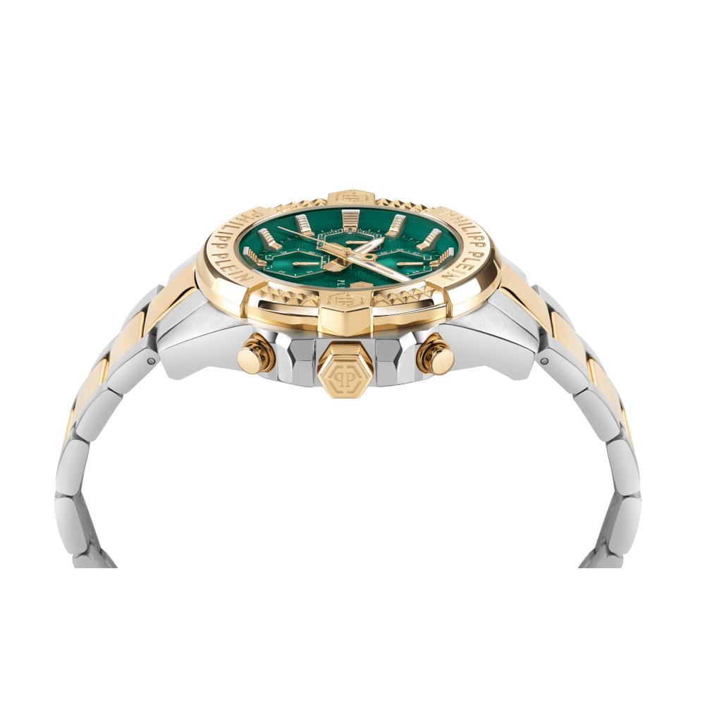 Ένα ρολόι χρονογράφος, της σειράς The Skull, του οίκου Philipp Plein, από ανοξείδωτο ατσάλι και επιχρυσωμένο ανοξείδωτο ατσάλι, με πράσινο καντράν.