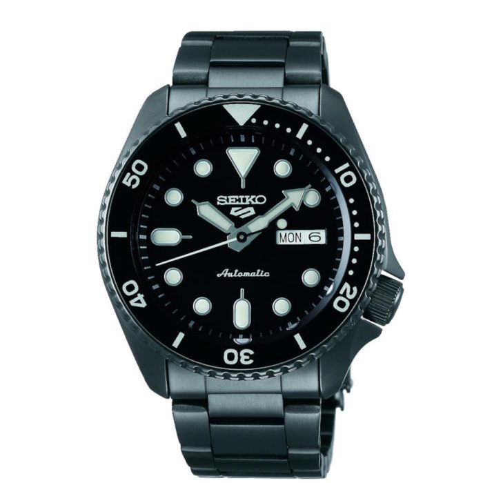 Ένα αυτόματο ρολόι, της σειράς 5 Sports, του οίκου SEIKO, από γκρι ανοξείδωτο ατσάλι με μαύρο καντράν.