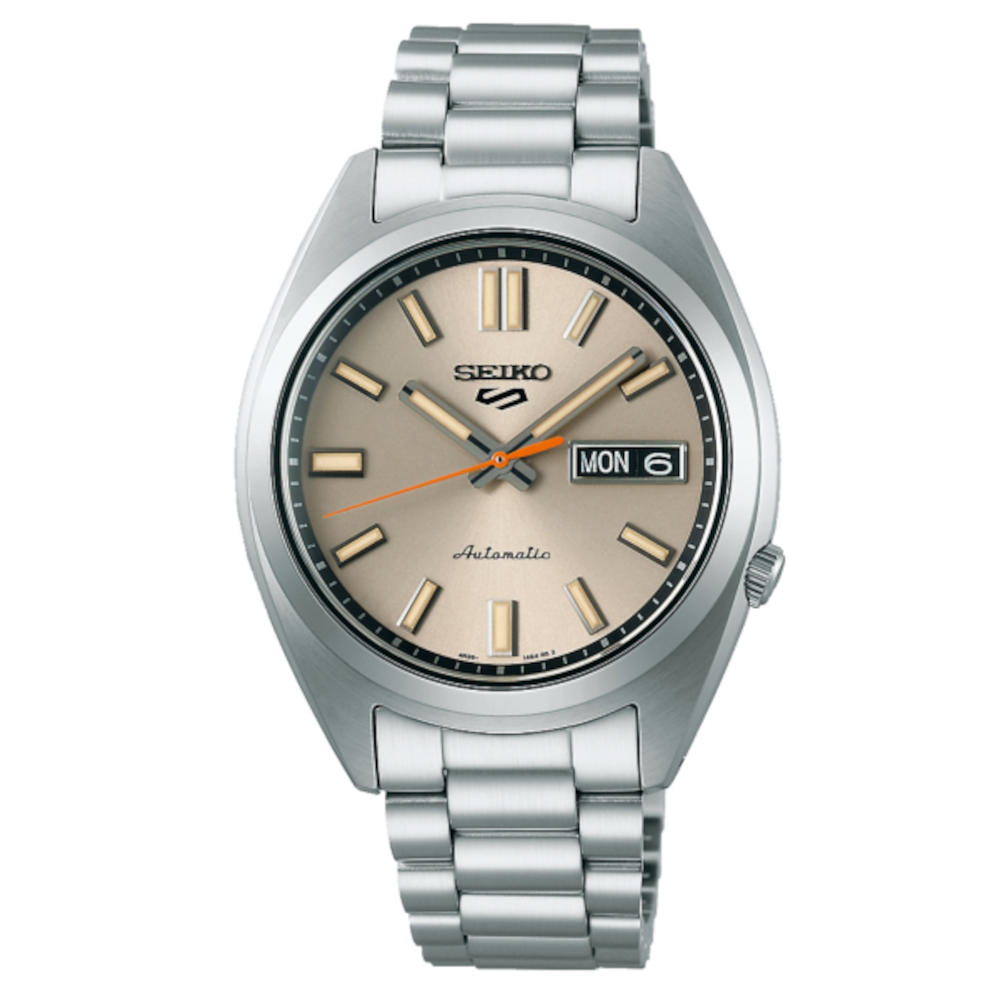 Ένα αυτόματο ρολόι, της σειράς 5 Sports, του οίκου SEIKO, από ανοξείδωτο ατσάλι με μπεζ καντράν.
