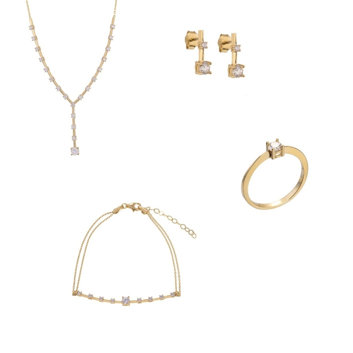 Ένα υπέροχο σετ από Κίτρινο χρυσό 14 Καράτια με ζιργκόν. Το σετ περιλαμβάνει κολιέ, βραχιόλι, δαχτυλίδι και ένα ζευγάρι σκουλαρίκια.