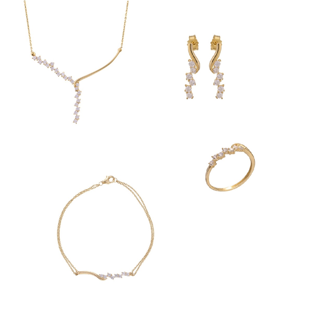 Ένα υπέροχο σετ από Κίτρινο χρυσό 14 Καράτια με ζιργκόν. Το σετ περιλαμβάνει κολιέ, βραχιόλι, δαχτυλίδι και ένα ζευγάρι σκουλαρίκια.