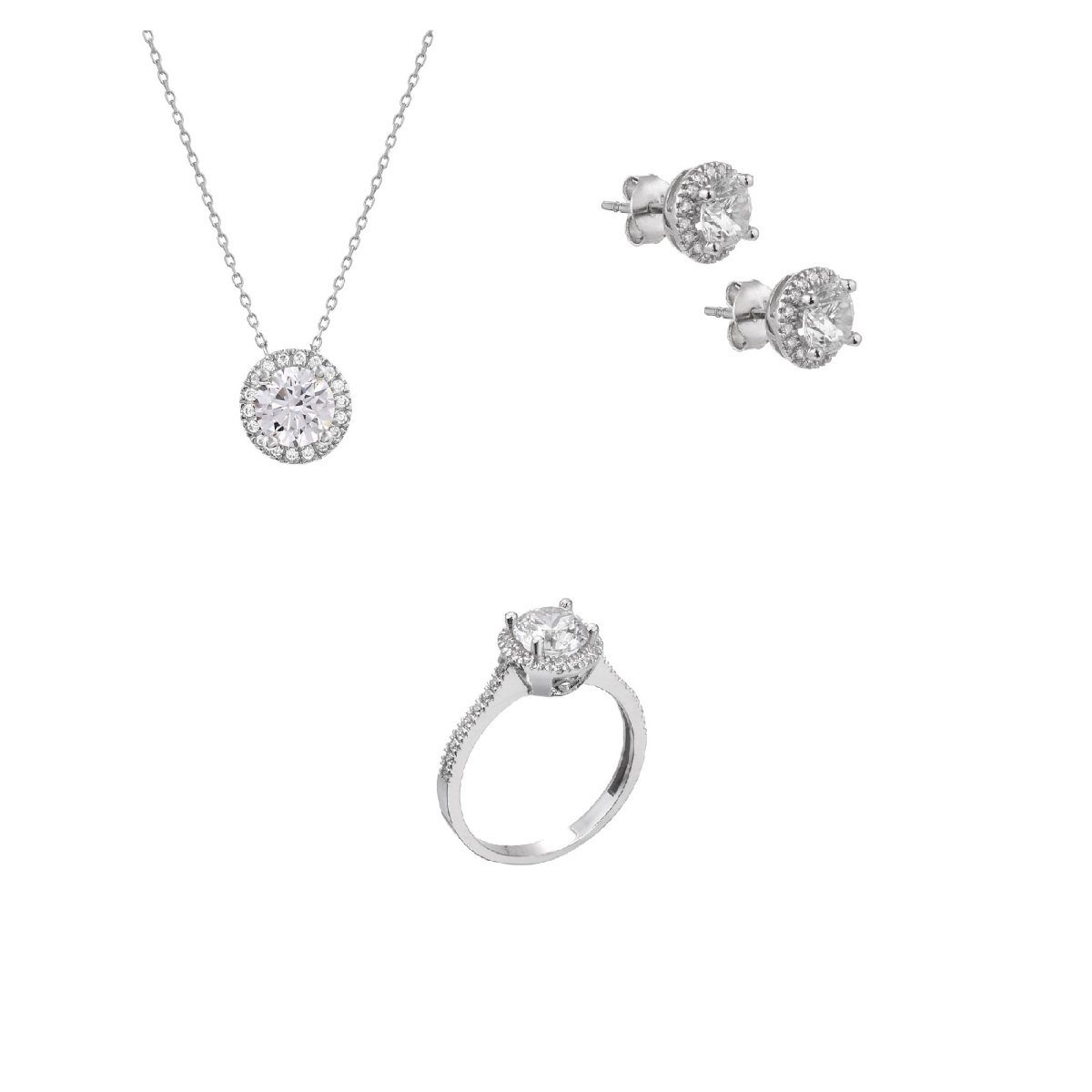 Ένα υπέροχο σετ από Λευκόχρυσο 14 Καράτια με ζιργκόν. Το σετ περιλαμβάνει κολιέ, δαχτυλίδι και ένα ζευγάρι σκουλαρίκια.