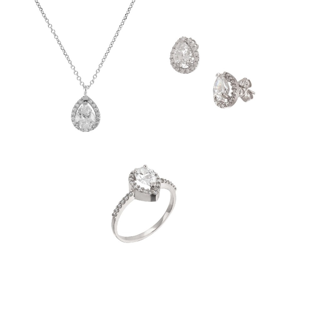 Ένα υπέροχο σετ από Λευκόχρυσο 9 Καράτια με ζιργκόν. Το σετ περιλαμβάνει κολιέ, δαχτυλίδι και ένα ζευγάρι σκουλαρίκια.