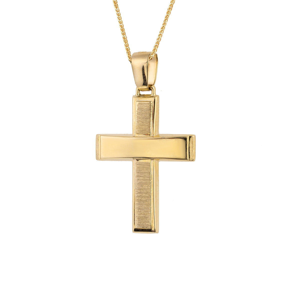 Ένας υπέροχος Σταυρός διπλής όψεως από Κίτρινο χρυσό και Λευκόχρυσο 14 Καράτια. Συνοδεύεται από αλυσίδα σε Κίτρινο χρυσό 14 Καράτια.