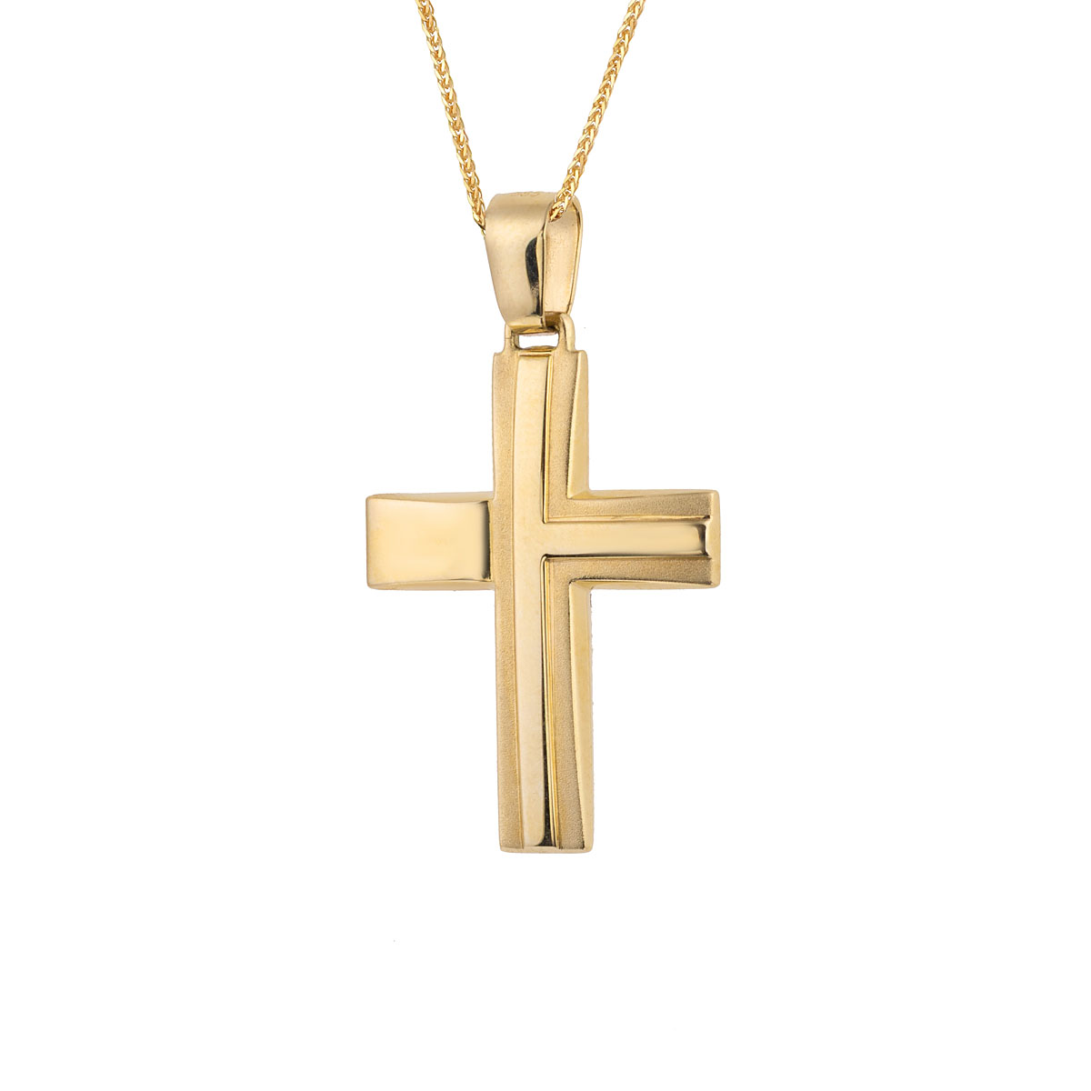Ένας υπέροχος Σταυρός διπλής όψεως από Κίτρινο χρυσό και Λευκόχρυσο 14 Καράτια. Συνοδεύεται από αλυσίδα σε Κίτρινο χρυσό 14 Καράτια.