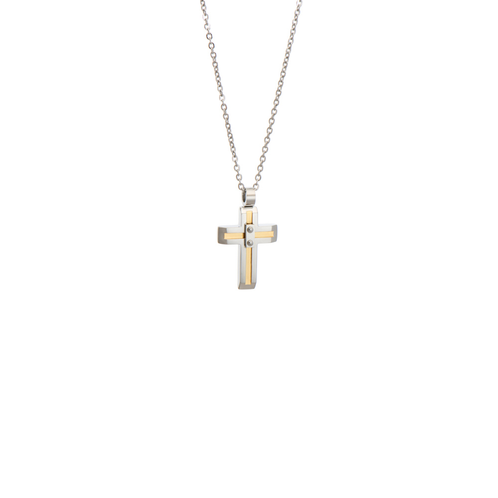 Ένα μοντέρνο ανδρικό κολιέ με σταυρό, της εταιρείας Visetti, από ανοξείδωτο ατσάλι και κίτρινο επιχρυσωμένο ανοξείδωτο ατσάλι.