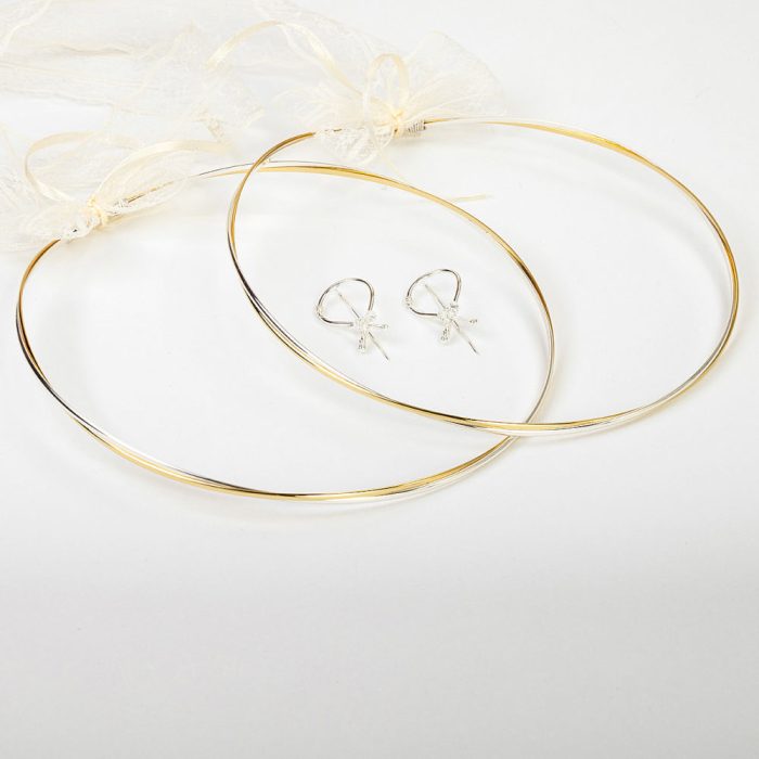 Στέφανα γάμου χειροποίητα, κατασκευασμένα από ασήμι 925°, με διπλή βέργα σε λουστρέ χρυσή και ασημί επιφάνεια. Συνοδεύονται από τις καρφίτσες και το κουτί τους.