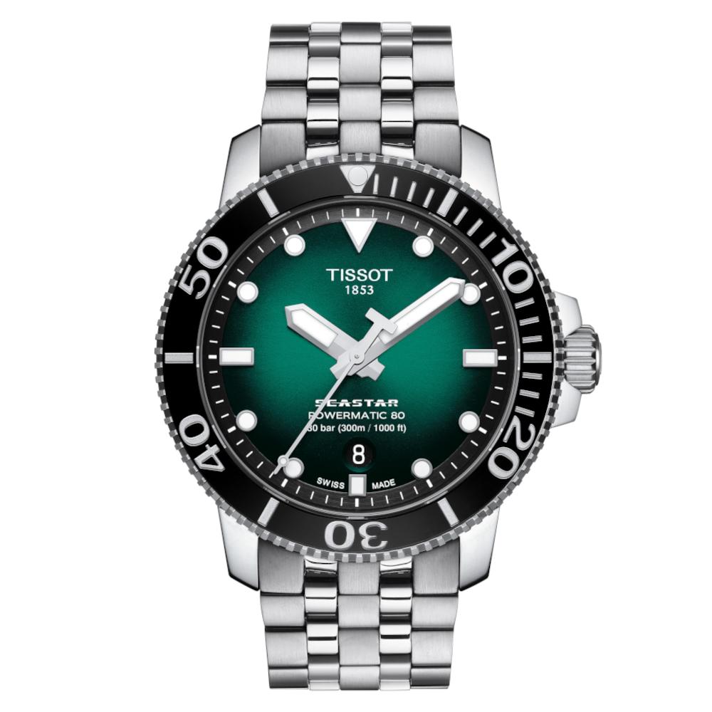 Ένα Ελβετικό καταδυτικό ρολόι, με αυτόματο μηχανισμό, της σειράς SEASTAR 1000, από τη συλλογή T-Sport, του οίκου Tissot, από ανοξείδωτο ατσάλι μαύρο-πράσινο καντράν. Με κωδικό T120.407.11.091.01