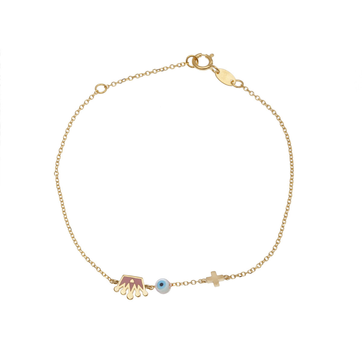 Ένα όμορφο βραχιόλι από 14 Καράτια Κίτρινο χρυσό με σμάλτο, σταυρουδάκι και ματάκι. Ιδανικό δώρο για νεογέννητο και βάπτιση.